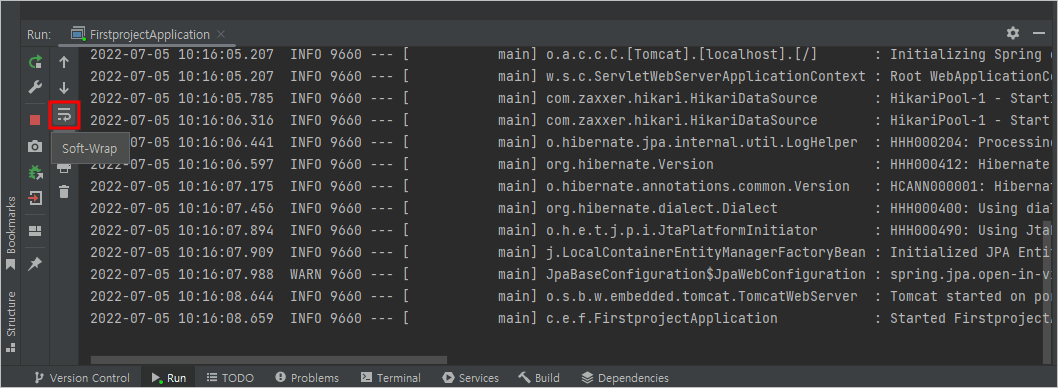 콘솔 창에도 적용이 안되어 있다면 왼쪽에 3번째 버튼에 마우스를 갖다 대면 [Soft-Wrap]이라고 표시가 됩니다. 버튼을 클릭합니다.