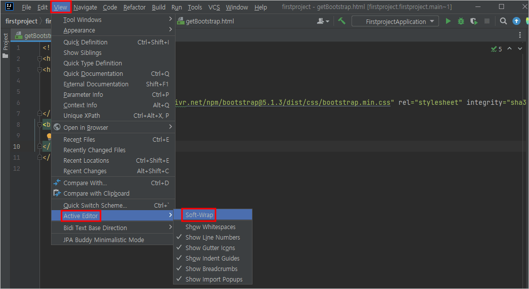 [View] 탭에 [Active Editor] 중 [Soft-Wrap]을 클릭하여 체크해줍니다.