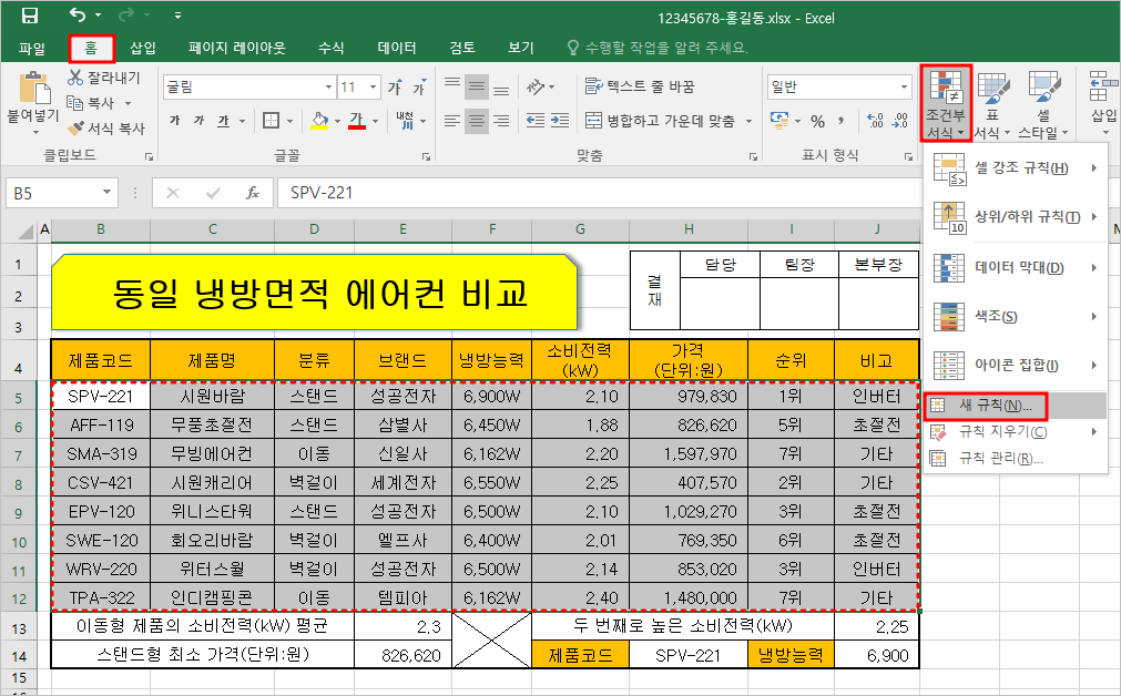 「B5:J12」셀을 선택하고 [홈] 탭에서 [조건부 서식] 중 '새 규칙'을 클릭합니다.
