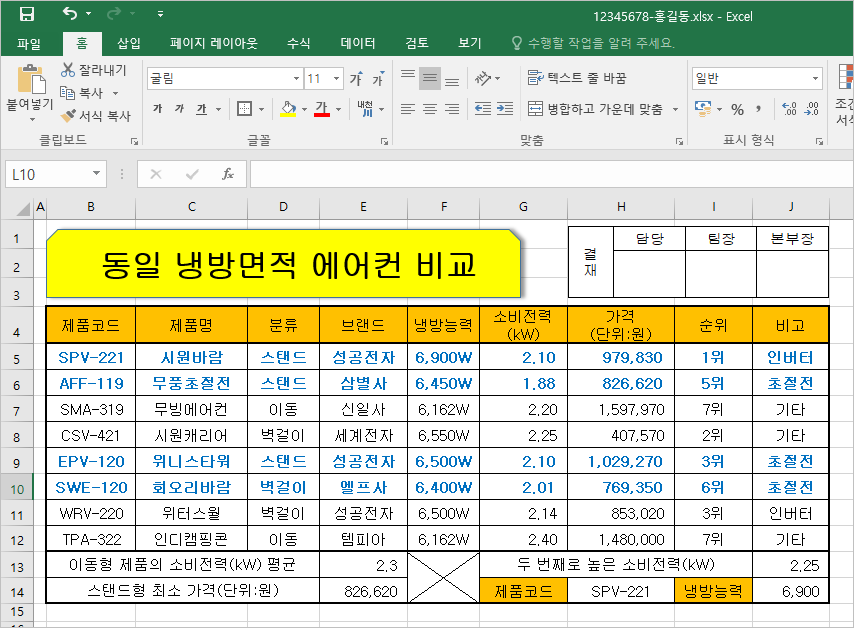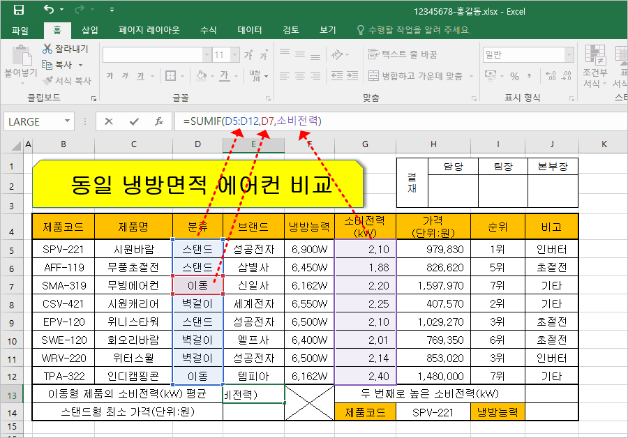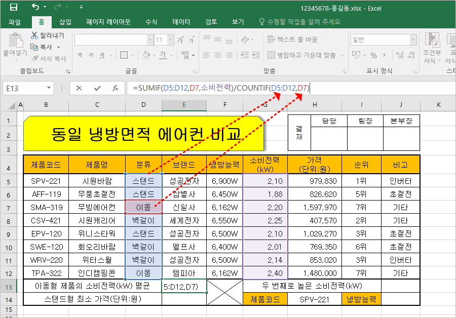 「E13」셀에 =SUMIF(D5:D12,D7,소비전력)/COUNTIF(D5:D12,D7)를 입력하고 [Enter키]를 누릅니다.
