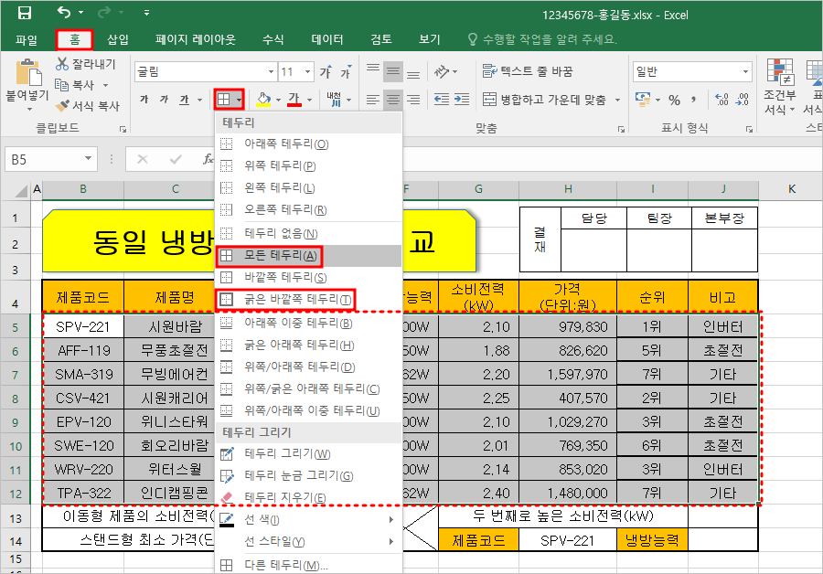 「B5:J12」셀을 선택한 후 [홈] 탭에서 [테두리] 중 '모든 테두리'와 '굵은 바깥쪽 테두리'를 적용합니다.