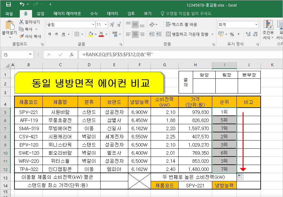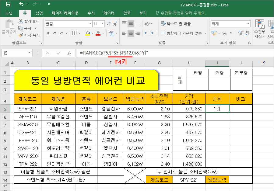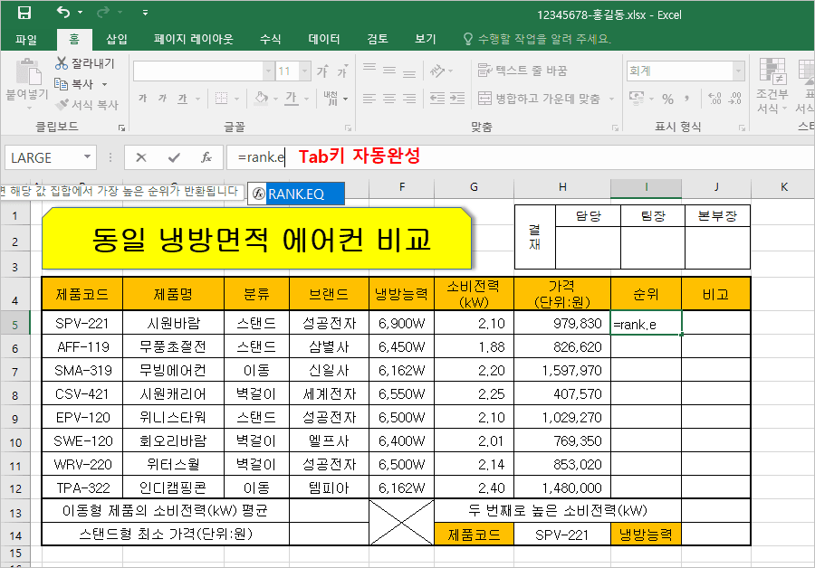(1) 순위 => 냉방능력의 내림차순 순위를 구한 결과에 '위'를 붙이시오 (RANK.EQ 함수, & 연산자)(예:1위)