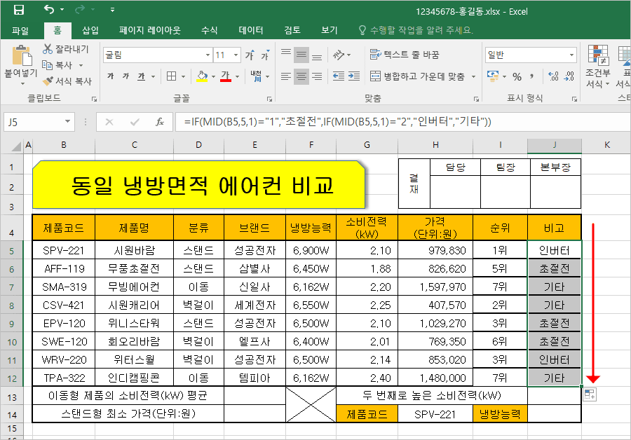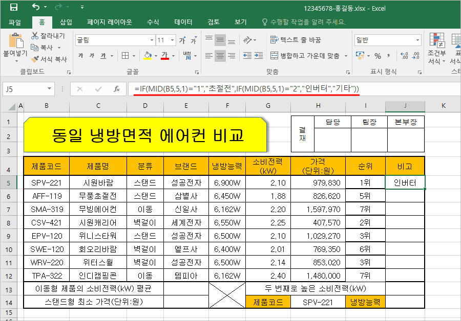 「I12」셀에 =IF(MID(B5,5,1)="1","초절전",IF(MID(B5,5,1)="2","인버터","기타"))를 입력하고 [Enter키]를 누릅니다.