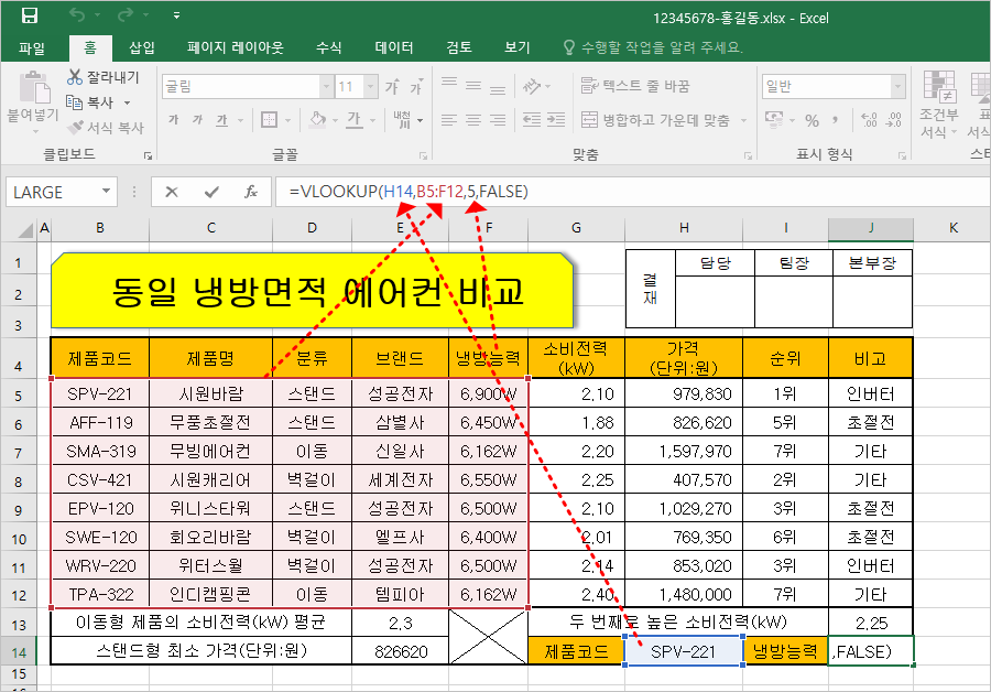 (6) 냉방능력 => 「H14」셀에서 선택한 제품코드에 대한 냉방능력을 구하시오(VLOOKUP 함수).