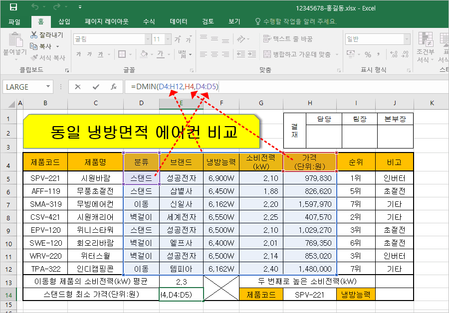 「E14」셀에 =DMIN(D4:H12,H4,D4:D5)를 입력하고 [Enter키]를 누릅니다.