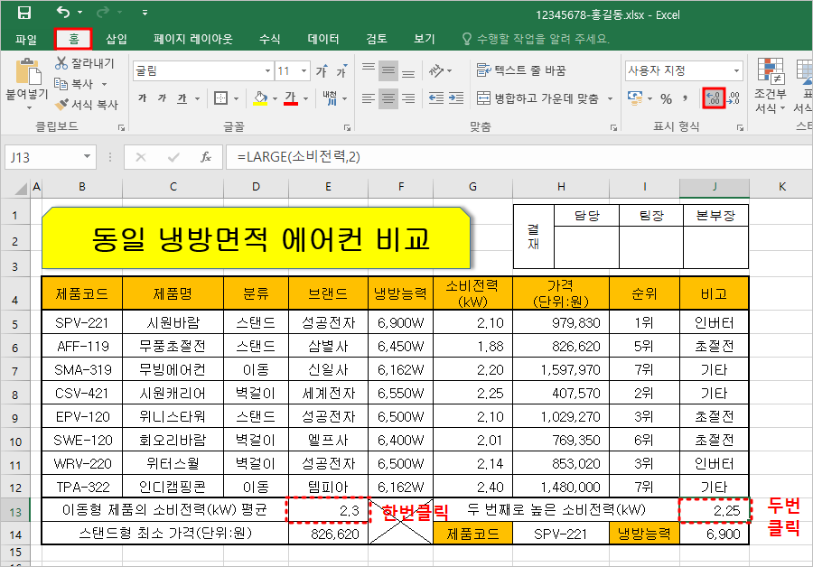 「J13」셀에 =LARGE(소비전력,2)를 입력하고 [Enter키]를 누릅니다.